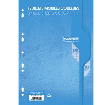100 pages perforées. Réglure Seyès grands carreaux. Feuillets mobiles couleur 80 g. Sous film avec encart.