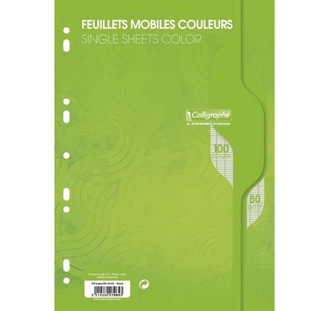 100 pages perforées. Réglure Seyès grands carreaux. Feuillets mobiles couleur 80 g. Sous film avec encart.