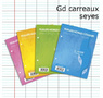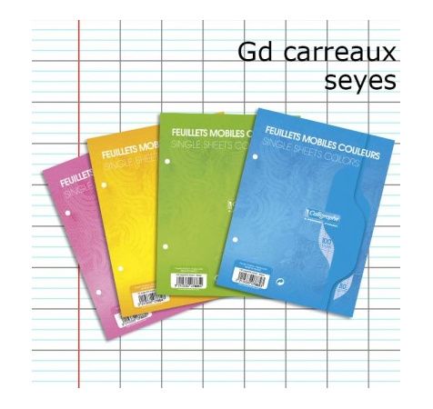 100 pages perforées. Réglure Seyès grands carreaux. Feuillets mobiles couleur 80 g. Sous film avec encart. Coloris : Bleu, rose, jaune, vert CAL7000 Conditionnement conseillé par 10