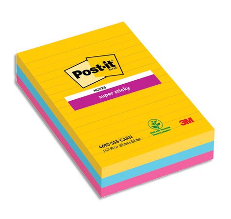 Lot de 3 blocs de 45 notes repositionnables Super Sticky 2XL lignés Rio
