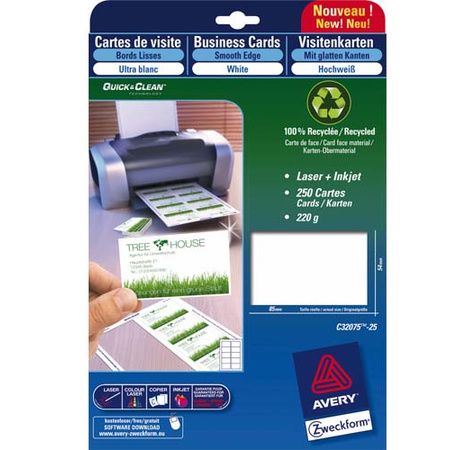 Simple et rapide, créez votre propre carte avec image, logo et/ou texte. Plusieurs formats et impression recto/verso pour plus de possibilités. Technologie "Quick & Clean" pour une séparation rapide et facile de vos cartes. Les bords sont parfaitement lisses. Papier ultra blanc et épais pour un rendu parfait et durable. Compatibles toutes imprimantes. Support A4.