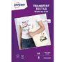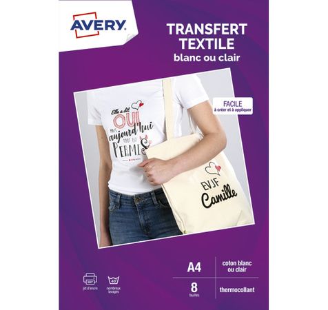 Feuilles de transfert T-shirt format A4 pour textiles en coton. Séchage instantané. Résistent à de nombreux lavages. Modèles et logiciel gratuits sur www.avery.fr. Textile noir ou foncé, pochette de 4 feuilles.