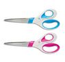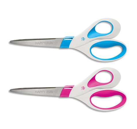 Lames en inox. Anneaux ergonomiques et asymétriques bi-matière. Coloris assortis : blanc/fuchsia et blanc/bleu. Sous blister.