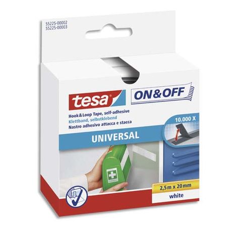 Ruban avec système de scratch autoagrippant (à coller), 2,5 m x 20 mm. Maintien sûr d'objets légers. Utilisable jusqu'à 10 000 fois. Coloris : Blanc Conditionnement conseillé : 6