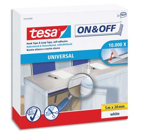 Bande adhésive auto agrippante blanche 20 mm x 5 m : un côté crochets, un côté velour, repositionnale 10 000 fois. Idéal pour accrocher, décrocher des objets légers, (nappe, tableau liège).