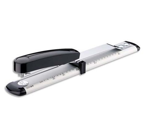 En métal avec coque ABS brillante très résistante. Pour brochures de formats DIN A6 à DIN A2.Socle en aluminium anodisé argent antidérapant. Système de chargement à ressort avec guide d'agrafes double. Enclume réversible fonction agrafage et épinglage. Profondeur d'agrafage 300 mm.