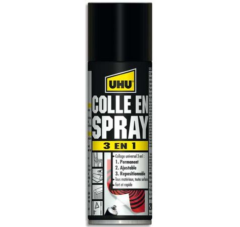 Colle universelle en spray 3 en 1 : permanent, ajustable, repositionnable. Tous matériaux, sur toutes surfaces. Contenance 200 ml.