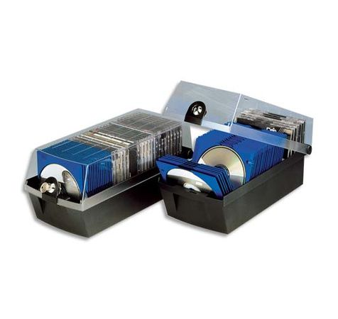 Boîte en polystyrène antistatique de grande capacité : jusqu'à 60 CD sur porte-CD Mäx ou 30 CD dans leur étui. Serrure (2 clés). Livrée avec 2 porte-CD Mäx.