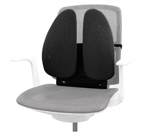 S'adapte parfaitement à la forme du dos pour un maximum de confort et une amélioration de la posture de travail - • Composé de deux parties indépendantes permettant la circulation de l'air - • Hauteur ajustable pour un soutien optimal, 7 niveaux de réglages di érents (de 14 à 23 cm) - • Fixation facile : sangles élastiques s'adaptant à tout type de chaise - • Dimensions (H x L) : 38 x 44 cm