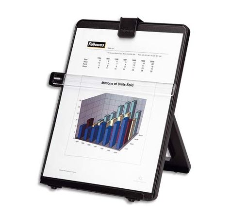 Porte-copies chevalet en plastique noir avec guide-lignes et pince document. Accepte jusqu'à 125 feuilles.