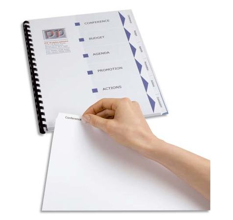 Contient : 1 couverture transparente, 1 jeu d'intercalaires, 1 sommaire, 1 feuille d'étiquettes transparentes, 1 dos cartonné.