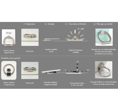 L’iRing pivote à 360° et s'incline à 180° pour optimiser sa prise en main et son angle d'affichage. Contrairement à des produits similaires, les fonctionnalités avancées de l'iRing ne souffriront pas d'un usage répété. Bénéficiant de matériaux de qualité et d'un usinage numérique à haute précision d'une tolérance de 0,01 mm, l'iRing est construit pour durer.
