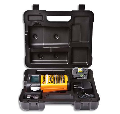 Clavier AZERTY, 16 caractères x 3 lignes. Utilise des rubans TZe de 3,5 à 18 mm et HSE de 6 à 18 mm. Ecran LCD rétro-éclairé-Impression sur 5 lignes. Vitesse d'impression : 20 mm/sec. Découpe manuelle. Fonctions drapeau, rotation, incrémentation, panneau et blocs. 383 symboles spécialistes, 7 cadres, 7 polices. Utilise 6 piles AA ou une batterie rechargeable BA-E001 (incluse). Livrée avec 1 malette de transport, 1 adaptateur AD-E001, 1 batterie rechargeable BA-E001 et 1 ruban TZe 18 mm Noir/Jaune (8 m) adhésif puissant.