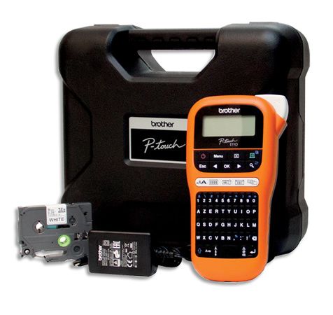 Utilise les rubans TZe de 3,5 à 12 mm - • Imprime jusqu'à 2 lignes de texte sur le même ruban - • Clavier AZERTY, écran 1 ligne - • Découpe manuelle des rubans - • Fonctions drapeau, rotation, incrémentation, panneau 200 symboles - • Vitesse d'impression 20mm/s - • Utilise 6 piles AAA (non fournies) - • Accessoire en option : Adaptateur AD-24ES (349108). - • PT-E110VP : livrée avec une mallette de transport et un adaptateur secteur