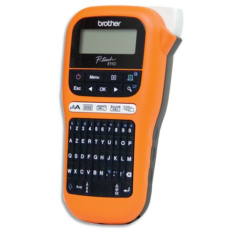 Utilise les rubans TZe de 3,5 à 12 mm - • Imprime jusqu'à 2 lignes de texte sur le même ruban - • Clavier AZERTY, écran 1 ligne - • Découpe manuelle des rubans - • Fonctions drapeau, rotation, incrémentation, panneau 200 symboles - • Vitesse d'impression 20mm/s - • Utilise 6 piles AAA (non fournies) - • Accessoire en option : Adaptateur AD-24ES (349108). - • PT-E110VP : livrée avec une mallette de transport et un adaptateur secteur