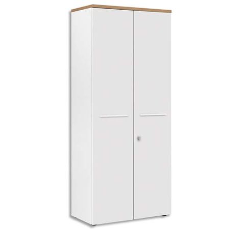 Armoire Haute 2 portes pleines Yes façade Blanche et dessus Merisier - L80 x H187 x P42 cm