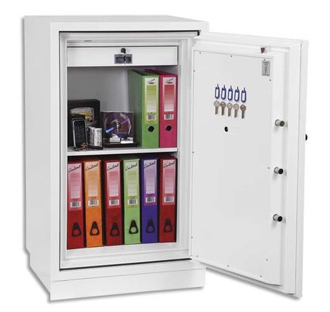 Coffre-fort ignifugé pour la protection de documents et d'objets précieux. Idéal pour les petites et moyennes entreprises, ce coffre offre une protection pour les documents (contrats, certificats, etc.) contre l'incendie pendant 1 H 30 selon la norme NT Fire 017-90 P (FS0441 et FS0442) et pendant 2 h selon la norme NT Fire 017-120 (DSO443) pour les documents papiers. Il est fourni avec serrure électronique de haute sécurité avec code jusqu'à 14 chiffres ou serrure à clé à double pannetons.