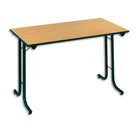 Plateau en panneaux de particules mélaminés épaisseur 19 mm. Chants anti-choc caoutchouc. Pieds pliants en tube d'acier Ø 3 cm. Peinture époxy noire. Verrouillage de sécurité en position ouverte et repliée. Butée de protection sous le plateau pour le stockage à plat. Epaisseur 8 cm, une fois repliée. Hauteur dépliée : 74 cm.
