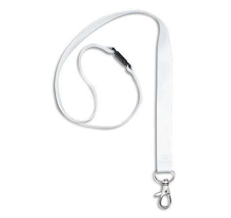 Boîte de 10 tours de cou avec mousqueton et clip de sécurité. Longueur 44 x largeur 1,5 cm. Blanc