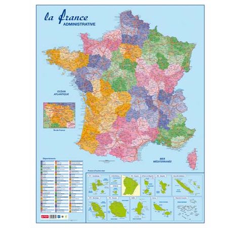 Carte France Administrative, Routière Et Dom-Tom Murale- Pélliculée 66X84,5cm - 4 Oeillets Pour Susp