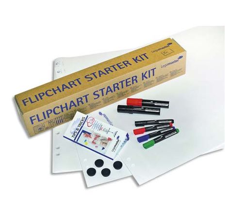 Kit complet pour chevalet comprenant le papier ainsi que les accessoires : 3 blocs de papiers de 20 feuilles unies (98 x 65 cm), un jeu de 4 marqueurs pour blocs papier assortis (noir, rouge, bleu vert), un jeu de 2 marqueurs Jumbo (noir, rouge), 4 aimants de 30 mm et un livret de conseils et d'astuces.