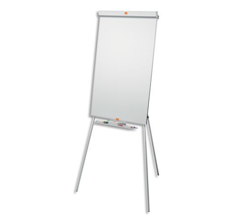 Surface en acier laqué magnétique avec technologie Nano Clean qui augmente l'effaçabilité de 30 %. Adapté pour une utilisation modérée. Base trépieds avec goupilles-poussoirs pour réglage hauteur jusqu'à 184 cm. Livré avec crochets ajustables pour bloc papier, un auget porte-marqueurs et un marqueur effaçable à sec Nobo.