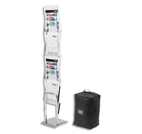 Présentoir sur pied, 4 niveaux en polystyrène, pliable, livré avec mallette/sac à dos, pour documents A4. Peut se plier chargé.
