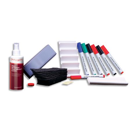 Kit nettoyant complet avec accessoires pour tableau blanc, idéal pour usage quotidien.