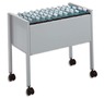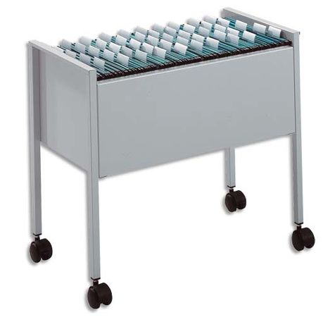 En métal, peinture époxy gris clair. Le chariot se déplace aisément entre les postes de travail grâce à ses 2 roulettes dont 2 avec freins. Sa faible hauteur permet de le glisser sous un bureau. Peut contenir jusqu'à 50 dossiers dos en V.