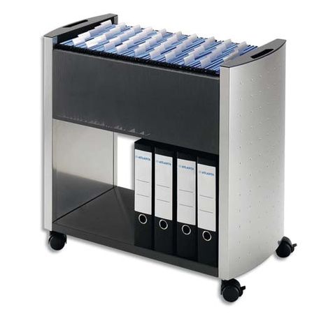 Capacité maximale de 50 dossiers suspendus dos en V, avec tablette inférieure pour rangement. Fabriqué en acier avec revêtement époxy polyester. Panneaux latéraux arrondis en métal avec effet perforé décoratif. Poignées intégrées sur les côtés.