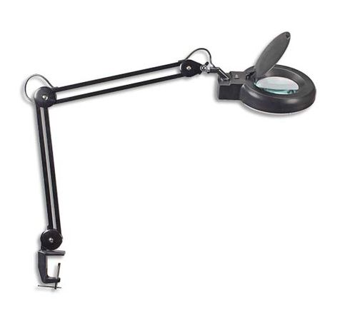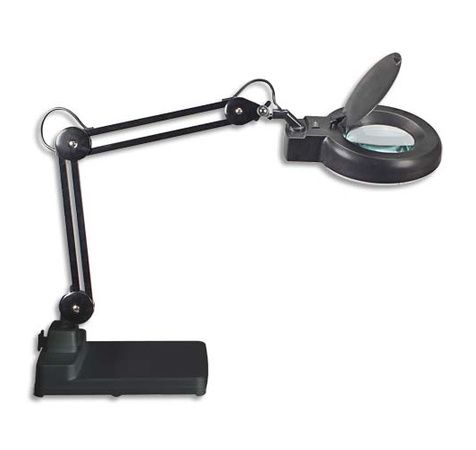 Avec clapet de protection contre la poussière et le soleil. Lentille de 3 dioptries (grossissement 1,75), diam 12,7 cm, surface de la lentille 126 cm2. Bras métallique en forme de parallélogramme. Tête diam 22,5 cm avec interrupteur.