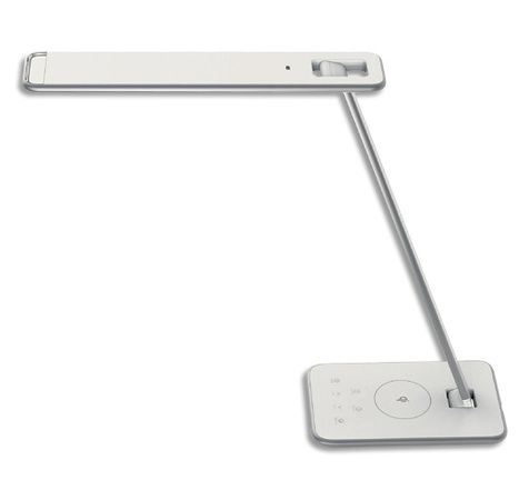 Bras en aluminium et tête et socle en plastique. LED intégrées 11W, 1000lm. Interrupteur tactile sur socle à 4 niveaux d'intensité et 3 niveaux de couleur d'éclairage. Equipé d'un port USB et d'un chargeur QI* sans fil. Classe énergétique A+. *Chargement par induction grâce à une technologie basée sur la transmission d'energie sans fil.