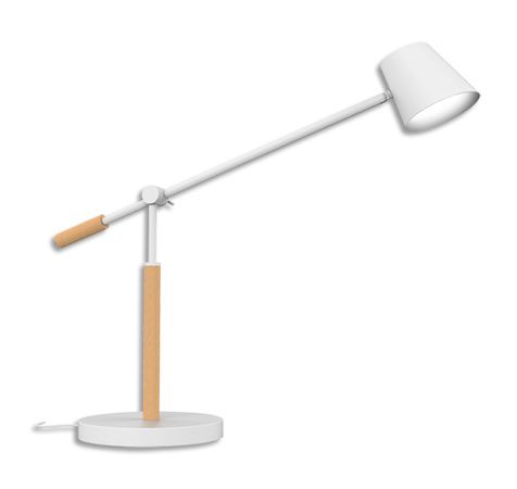 Bras, tête et socle en métal peint epoxy et fût en bois issu de forêts gérées de manière éco-responsable. Bras réglable, tête orientable. Variation tactile 3 intensités sur socle. Chargeur de téléphone via un port USB sur le socle. Equipée de LED intégrées 5W, 50 000h, 500 Lumens. Classe énergétique A+. Dimensions : base 18 cm, bras 47 cm, hauteur 44 cm.