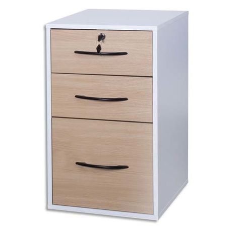 264906 : 3 tiroirs : 2 tiroirs de bureau et 1 tiroir pour dossiers suspendus. Hauteur 69cm. 1 serrure pour le premier tiroir.