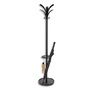 En acier. Base lestée en métal de 5 kg et Ø 38 cm garantit une parfaite stabilité. Tête rotative avec 6 patères en plastique et trois crochets, porte-parapluies, coupelle de récupération d'eau. Ses 6 patères larges en plastique-permettent une grande capacité d'accroche et garantissent le respect des vêtements. Son porte-parapluies astucieux peut accueillir jusqu'à 6 parapluies. Hauteur : 170 cm.