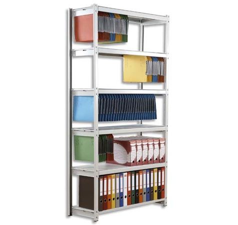 Système prêt à monter sans vis ni boulons. Montage facile par simple emboîtement. Montants en acier 15/10ème époxy gris. Cadre acier 8/10 epoxy gris. Possibilité d'ajouter à droite ou à gauche un ou plusieurs éléments de mêmes dimensions. Utilisation 5 niveaux intervalles pour DS ou 4 niveaux pour DS et 1 niveau pour boîtes archives.