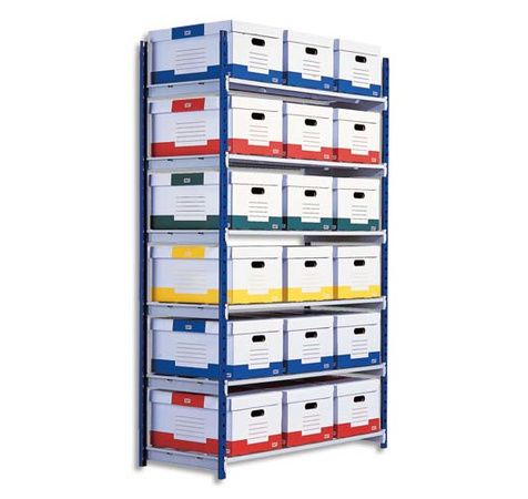 Structure et tablettes à claire-voie en acier finition peinture époxy gris et bleu. Embouts plastiques à la base des-montants. Largeur des tablettes : 100 cm. Tablettes réglables en hauteur tous les 5 cm. En option : plateaux Isorel-pour tablettes. Supporte jusqu'à 180 kg par tablette. Montage facile sans outils ni vis. Système breveté de fixation des-tablettes pour une stablilité incomparable.