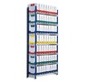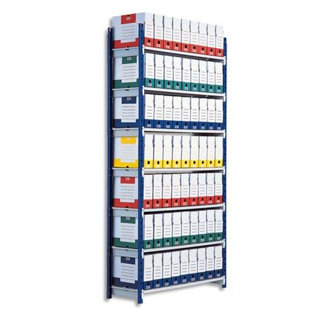 Structure et tablettes à claire-voie en acier finition peinture époxy gris et bleu. Embouts plastiques à la base des-montants. Largeur des tablettes : 100 cm. Tablettes réglables en hauteur tous les 5 cm. En option : plateaux Isorel-pour tablettes. Supporte jusqu'à 180 kg par tablette. Montage facile sans outils ni vis. Système breveté de fixation des-tablettes pour une stablilité incomparable.