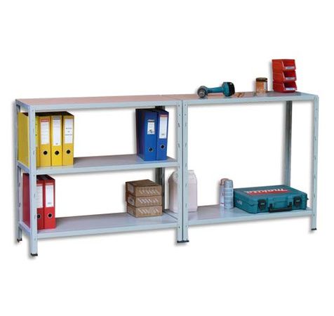 Très économique pour bureaux, archives, réserves, caves... - S'utilise en hauteur de 2 m ou en 2 éléments de 1 m. - Système prêt à monter sans vis ni boulons. - Excellente rigidité. Capacité de charge de 80 kg par tablette. - 5 tablettes en acier laqué époxy gris clair. - Montants de 1 m avec embouts plastique.