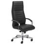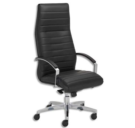 Dossier et assise en croûte de cuir vachette, rembourrage mousse densité 40 Kg/m3, assise réglable en hauteur par vérin pneumatique, piétement 5 branches en fonte d'aluminium poli, accotoirs en acier avec manchettes cuir, mécanisme basculant décalé réglable en intensité et multiblocable .