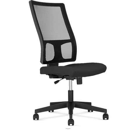 Siège haut dossier en résille portante (coloris noir). Densité de mousse 35 kg/m3. Mécanisme synchrone avec réglage central de la tension en fonction du poids de l'utilisateur, blocage multipositions et anti-retour de sécurité. Hauteur d'assise réglable 40 à 52 cm. Dimensions assise (l x p) : 47 x 45 cm. Dimensions dossier (l x h) : 45 x 60 cm. Accoudoirs réglables en option . Coloris : Assise noire