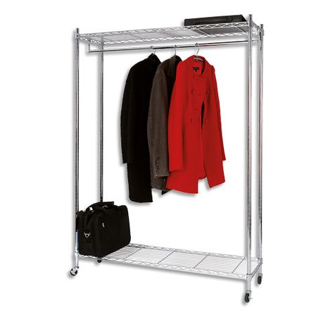 Fil en métal chromé, tubes Ø 30 mm. Grande capacité : jusqu'à 26 cintres ou 70 kg de vêtements. Galeries inférieure et supérieure. Grande mobilité grâce à ses 4 roues avec 2 freins. Dimensions (l x h x p) : 89 x 35 x 168 cm.