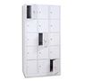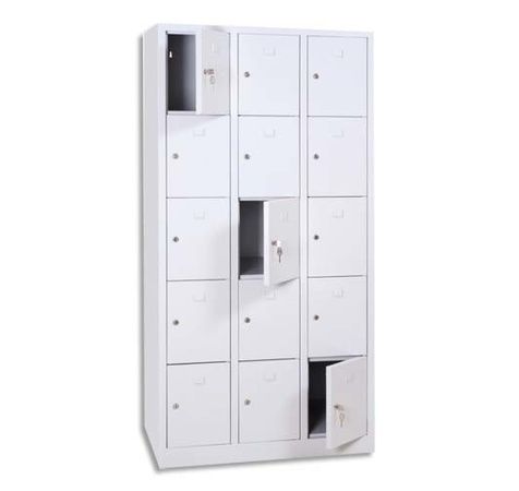 Construction monobloc soudée en tôle d'acier épaisseur 0.8 mm. Socle fond plat. Perforations en façade pour aération. Portes en métal avec porte étiquette. Fermeture par moraillon. Porte indégondable lorsqu'elle est fermée. Coloris Blanc. 2 versions : 4 cases et 5 cases.