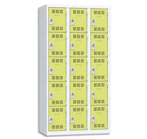 Construction monobloc soudée en tôle d'acier 1er choix épaisseur 0,7 mm. Socle fond plat. Perforations à l'arrière du fond pour permettre l'évacuation des poussières et liquides. Portes en métal avec porte étiquette. Fermeture par moraillon débraillable porte-cadenas (cadenas non fourni). Anti effraction par rotation. Niveau de résistance à l'effraction : classe C, selon la norme NF D65-760. Finition peinture en poudre époxy polyester. Dimensions d'une colonne (l x h x p) 30 x 180 x 50 cm. Livraison coloris Gris perle et Gris perle/Bleu : 20 jours, Gris perle/Anis et Gris perle/Basalte : 25 jours.