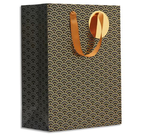 Sac cadeau papier grand format L26XH33cm Ecailles Noir&Or.Finition or à chaud.Poignées en ruban