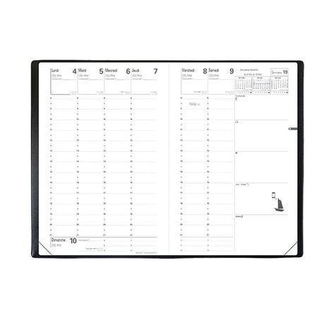 L’agenda Ministre QUO VADIS est l’agenda semainier par excellence en format nomade. Il vous permettra de voir tous vos rendez-vous en un seul coup d’œil grâce à sa disposition intérieure, 1 semaine sur 2 pages. Il est muni d’une couverture vinyle recyclé noire résistante et légère avec un grain maroquinerie et à une reliure cousue (sans spirale). Il vous sera facile d’emporter cet agenda Ministre QUO VADIS partout avec vous de par sa taille qui est de 16 x 24 cm. Cet agenda à un papier blanc de qualité supérieure certifié PEFC. Vous pourrez vous en servir tout au long de l’année car il débute en janvier jusqu’en 2019.