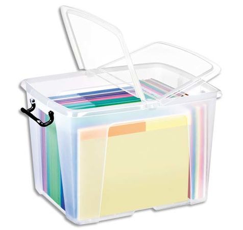 Pour ranger ou archiver documents ou fournitures en assurant une parfaite protection à l'humidité, la poussière et l'écrasement. Couvercle clipsé s'ouvrant sur 2 côtés pour un accès facile au contenu. 2 solides poignées clips assurent une fermeture efficace. Large rebord sur le pourtour pour transporter facilement la boîte. Empilables et superposables.