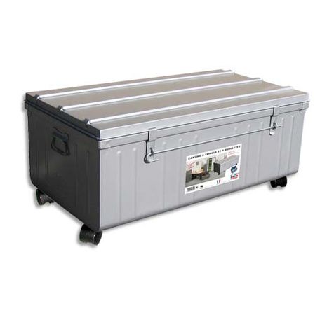Malle en métal laqué epoxy avec 4 roulettes pour faciliter le déplacement. 3 raidisseurs sur le couvercle et 2 sur le fond pour assurer la solidité. Toutes nos cantines sont fournies avec tringles et cadenas.