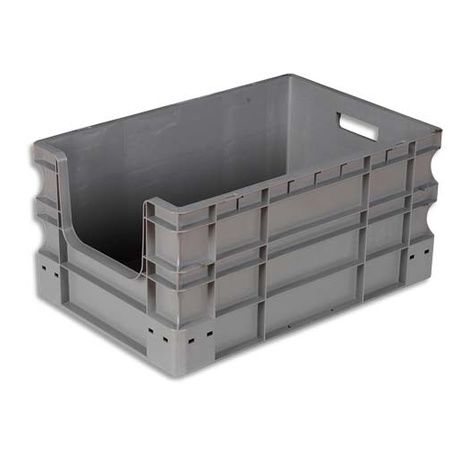 Accès facile du fait de leur large ouverture. Bacs de rangement à ouverture sur la largeur ou la longueur. En polypropylène gris. Gerbables. Norme Européenne.