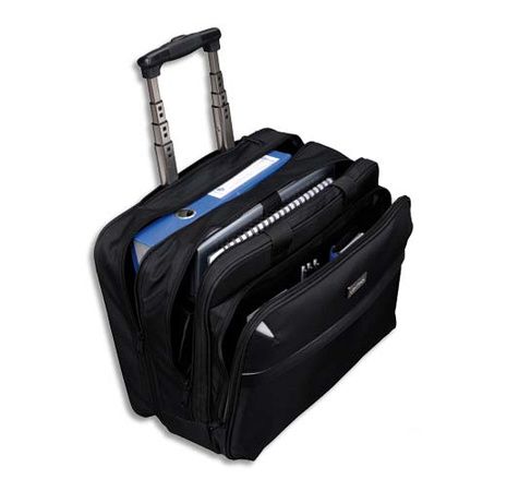 En polyester noir. Compartiment pour ordinateur jusqu'à 17" renforcé et compartiment plus important pour les vêtements et/ou documents. Deux poches zippées avec différents emplacements pour stylos, cartes, documents, téléphone etc. Transport grâce au trolley ou poignées matelassées.